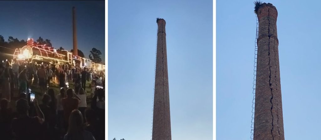 Durante a passagem pelo citado distrito, no entanto, um outro elemento acabou chamando a atenção de parte do público. Próxima à linha férrea, a chaminé de uma antiga olaria desativada despertou preocupação entre alguns visitantes do evento, sendo que alguns enviaram até mesmo fotos, como as desta publicação. A estrutura apresenta grandes rachaduras visíveis e levantam questionamentos sobre a segurança no local. O comentário de alguns visitantes foi de que, devido ao estado de deterioração, a torre parece que pode vir a ruir, causando prejuízos ou – pior – colocando pessoas em risco.