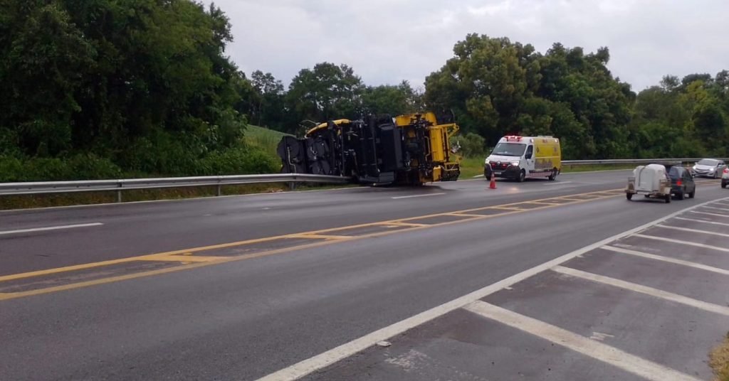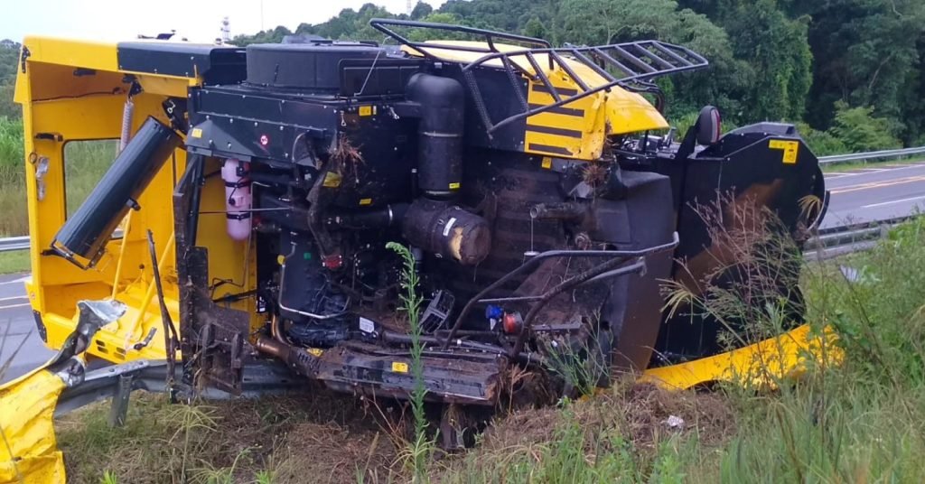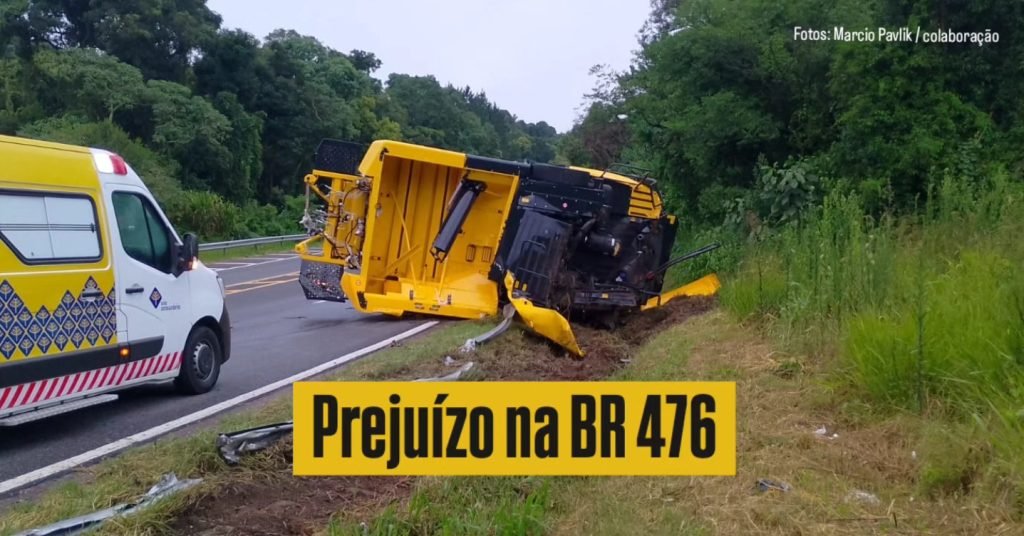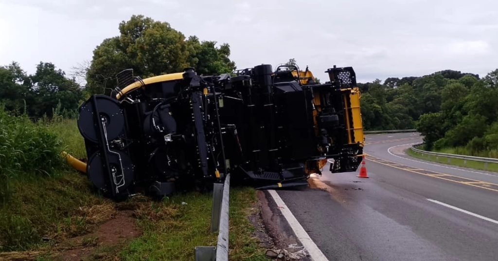 Uma colheitadeira de soja nova acabou sendo praticamente totalmente destruída na BR 476 / Rodovia do Xisto, localidade de Serrinha, em Contenda-PR. O acidente aconteceu neste sábado (07), no momento em que a carreta que a transportava fazia uma curva – a princípio, houve rompimento das cintas que sustentavam a carga. A carreta não chegou a tombar.