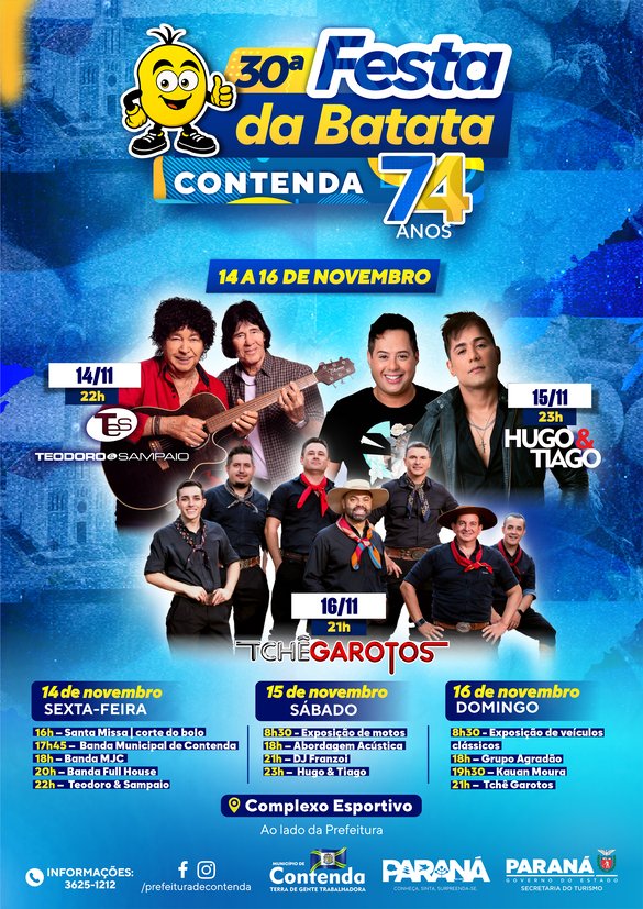 A Prefeitura de Contenda divulgou nesta quarta-feira (5), a programação oficial da 30ª Festa da Batata, evento que acontecerá em comemoração aos 74 anos do município. A programação terá início na próxima sexta-feira (14) e vai até domingo (16).