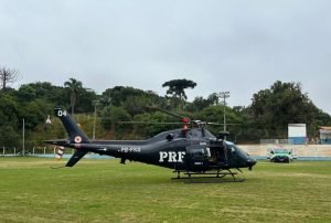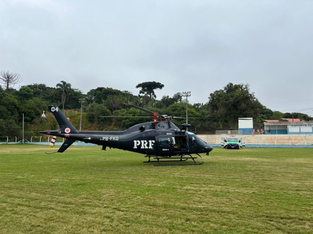 Na imagem acima, um helicóptero da Polícia Rodoviária Federal (PRF) que se deslocou até o estádio municipal do Lagoa Esporte Clube, em Contenda, na manhã deste domingo de Páscoa (05) para realizar o resgate de um homem.